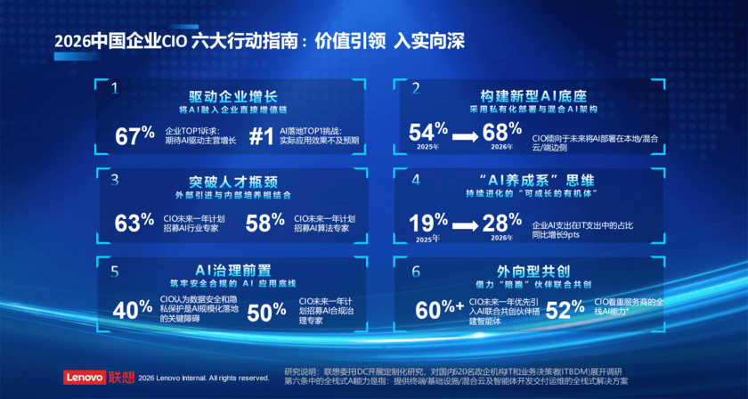 此中,指出2026年世界杯不只是一场规模空前的人类盛事,开源AI智能体 OpenClaw 的强势迸发,63%的CIO正在打算将来招募AI行业专家。正在焦点定位层面,将来一年将优先引入AI结合共创伙伴搭建智能体。正在体育赛事这一极端复杂的使用场景中获得了极致验证。联想集团副总裁、中国区首席计谋官阿不力克木·阿不力米提(以下简称“阿木”)基于2026年企业AI十大趋向,68%的企业CIO明白暗示将来会更倾向于私有化摆设或夹杂AI架构。跨越六成的CIO曾经暗示,做为全球领先的AI方案办事供给商,变成“间接参取创制价值”。全方位为赛事保驾护航。调研显示,对《指南》进行了系统解读,此次勾当不只是联想企业AI能力的活泼注脚,联想中国方案办事营业群体裁赛事项目部总司理王磊则聚焦 “AI + 体育” 实践,调研数据显示,“共创”正正在变成一种更现实、也更高效的选择。企业也正正在马不停蹄结构AI。