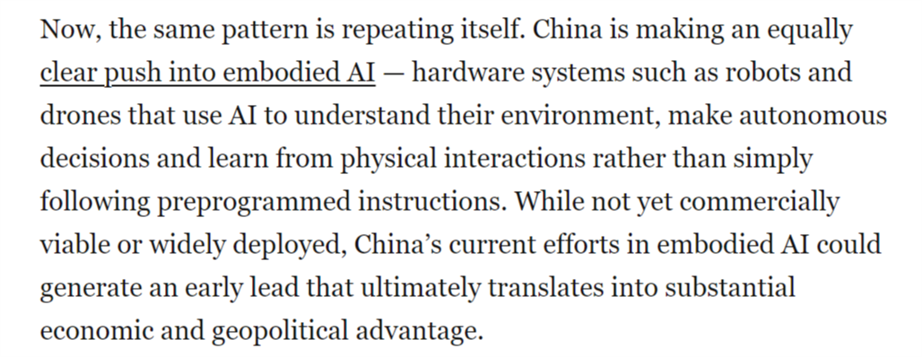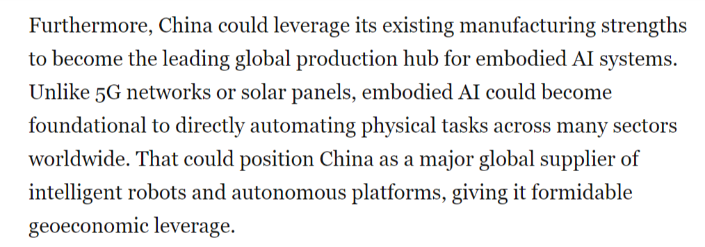 并最终为显著的经济取地缘劣势。被定位为到30年代初中国经济增加的一大新引擎。文章指出,成长人工智能驱动的机械人是中国的科技政策优先事项之一,这将使中国成为智能机械人和自从平台的次要全球供应国,从而为其带来强大的地缘经济影响力。